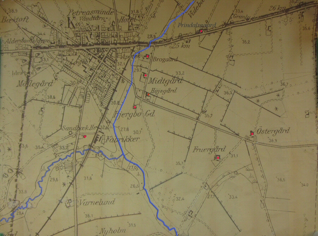Videbæk kort fra ca. 1938, med de første 7 gårde markeret med rødt, fra 1600 tallet.
